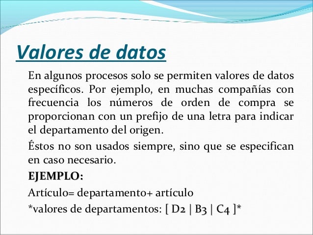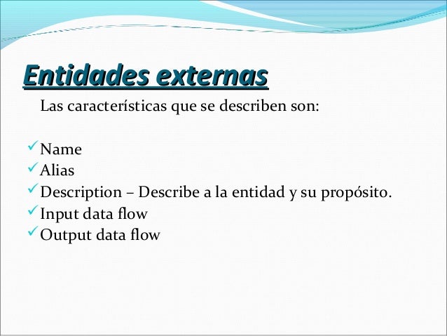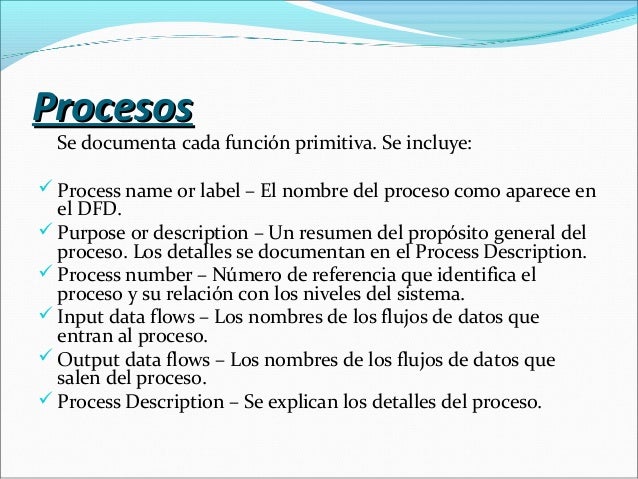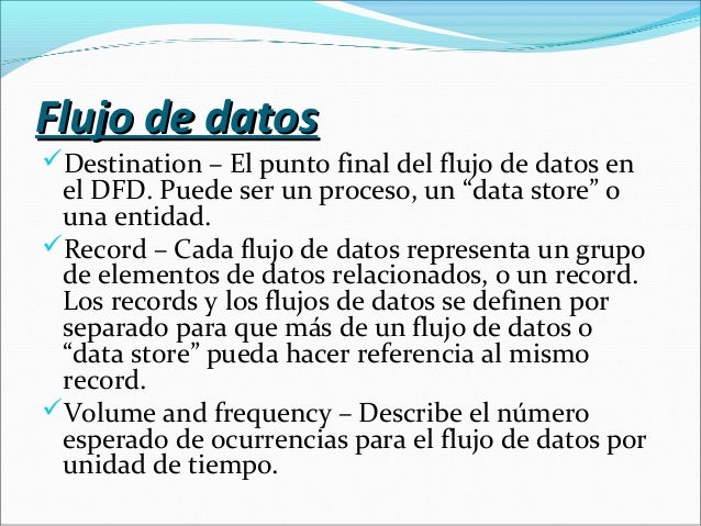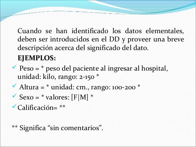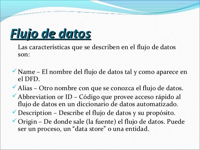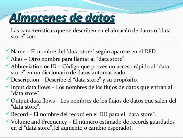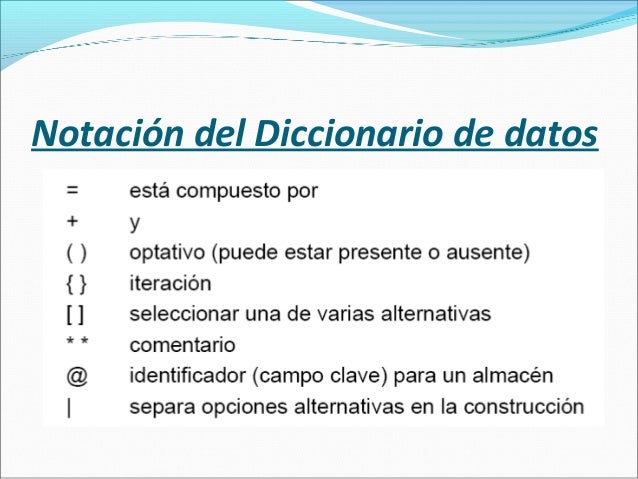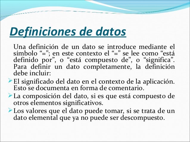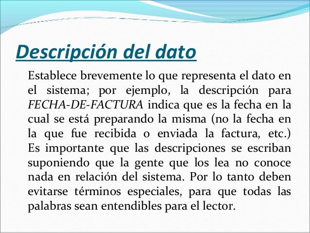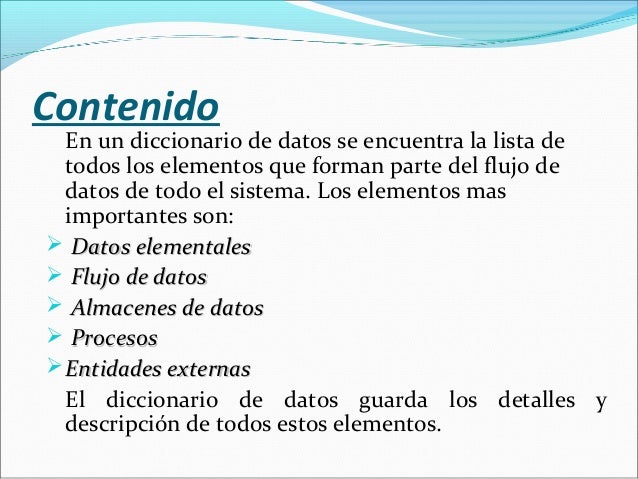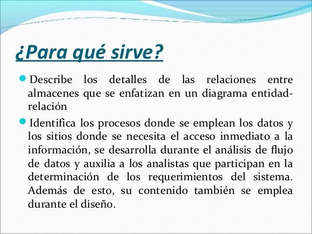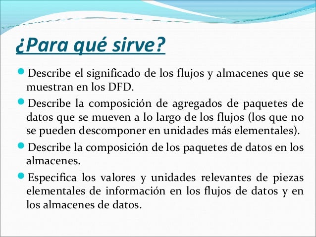 Define con precisión los datos de entrada, salida, componentes de almacenes, flujos, detalles de las relaciones entre almacenes, etc.Los diccionarios de datos son buenos complementos a los diagramas de flujo de datos , los diagramas e untidad-relación, etc.