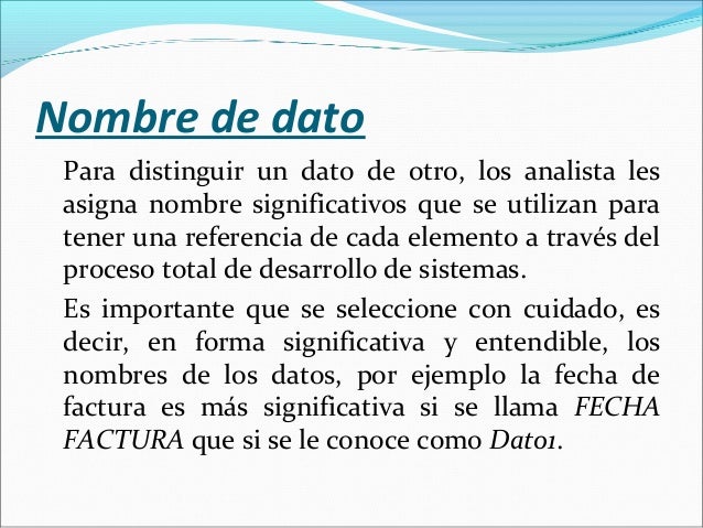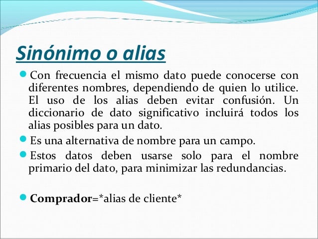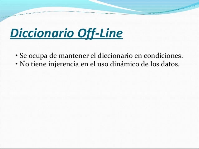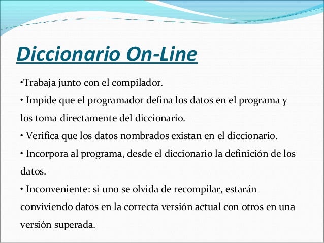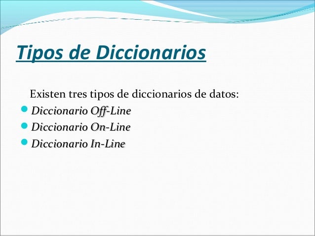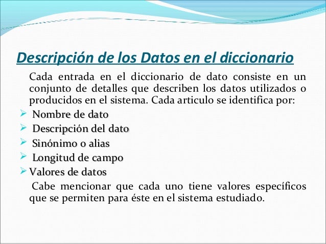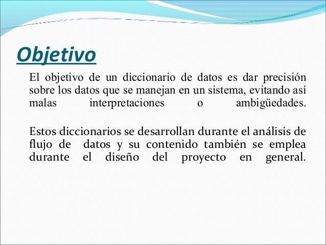 El diccionario de datos es un listado organizado de todos los datos que pertenecen a un sistema.El objetivo de un diccionario de datos es dar precisión sobre los datos que se manejan en un sistema, evitando así malas interpretaciones o ambigüedades.